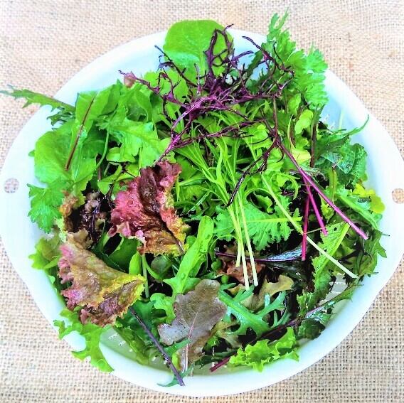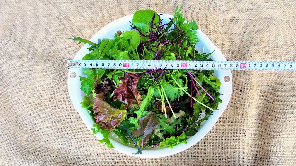 リーフレタス・ケール・リーフチコリ・水菜・からし菜・ルッコラ・パセリ・ビーツの葉・春菊・わさびリーフ・・・・・などいろんな野菜が入っています。