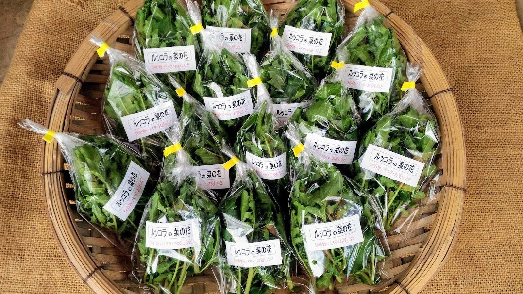 独特の辛みと、ごまのような香ばしい香りのルッコラは、春になると抽苔(トウ立ち)します。ルッコラの風味に菜の花の甘みを足したような食味でやわらかさもあります。さっと炒めたり蒸し焼きがおすすめです。ルッコラの菜の花は、まず出回らない希少な野菜です。